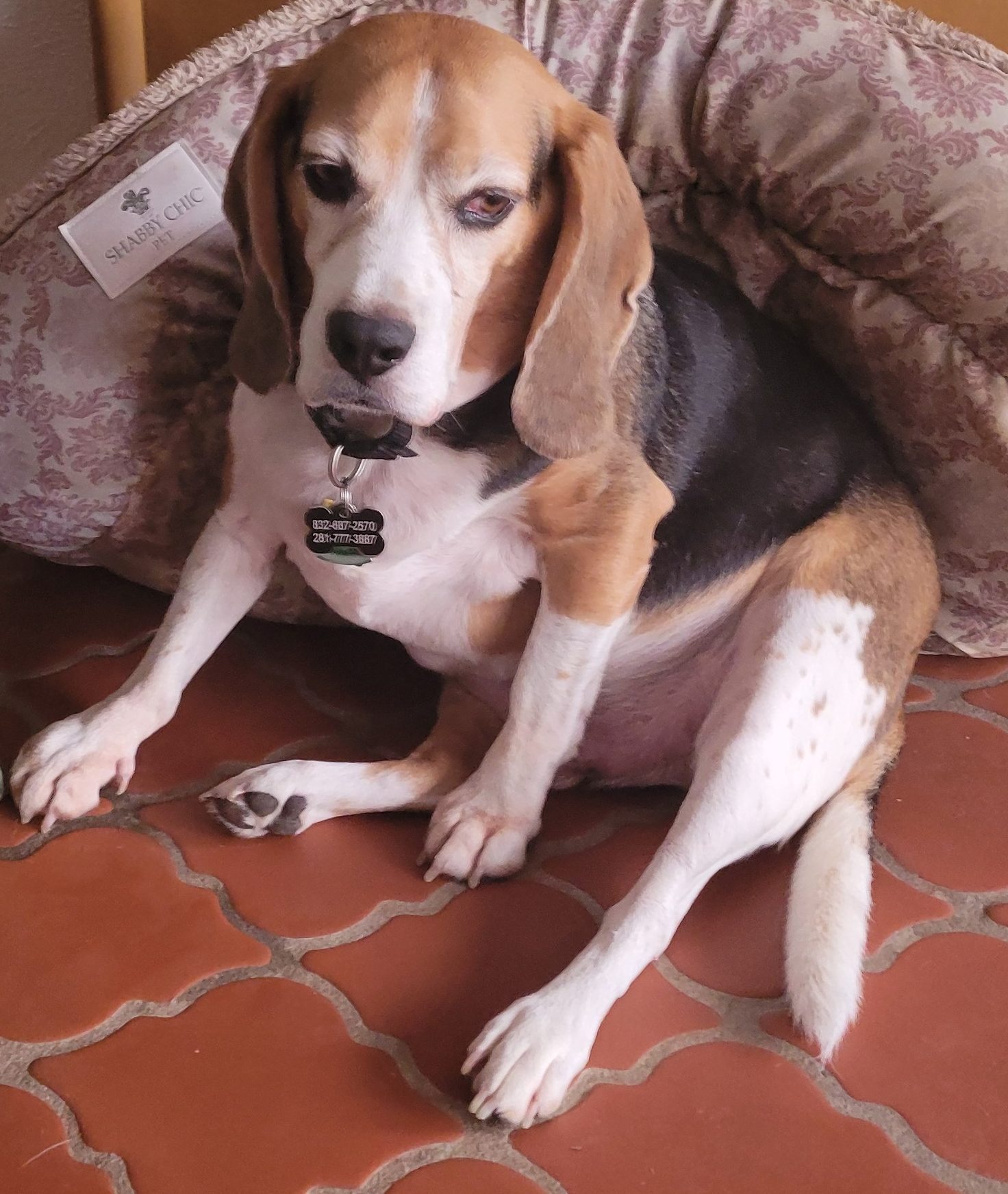 Homer is a 4-year-old boy who came to us from the Ft. Bend shelter in 2023. As a young, cute tri-color beagle, we felt he would be adopted quickly. He was placed in a foster home to polish up his house manners. Within a short period of time in his foster home, he had to be rushed to an emergency clinic when he started having seizures that wouldn’t stop. These are called cluster seizures. Diagnostic tests were done to see if there was an organic cause for the seizures and none was found. The recommendation was to try medications and monitor him. He did well for several months but then began having seizures again. The medications were adjusted and again, he did well for several months. Then he had another severe set of seizures that didn’t subside until emergency medical intervention. Again, his medications have been adjusted, and he is doing well after the last incident a few weeks ago.
