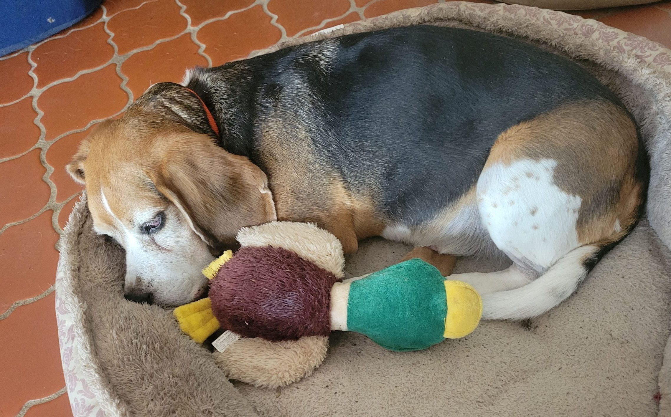 We never want to give up on any beagle if we feel the beagle can have a healthy life. With our limited resources, we are willing to make tough decisions when warranted due to the beagle’s age or potential low quality of life after a medical intervention. Though in Homer’s case as a younger beagle with no other health issues, our goal is a long and happy life with finding the correct medicine regime for him. Because of his special needs, he is probably unadoptable as most adopters are not prepared to take on this long-term responsibility and cost. The good news is that Homer has a loving foster home that has the right skills to care for him for as long as we have him. His foster mom, Ellen, says he loves hugs, chewing on his hoofies and he always spends time every night before falling asleep with his chew toys. While he never barks or howls, he does make a contented purring noise at times, and he does snore in his sleep.